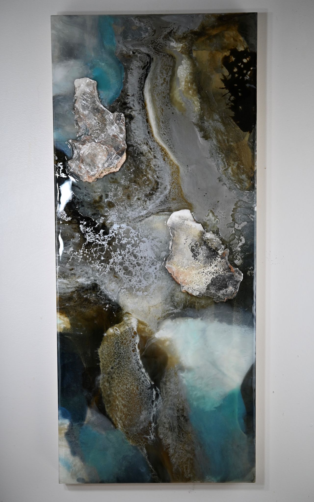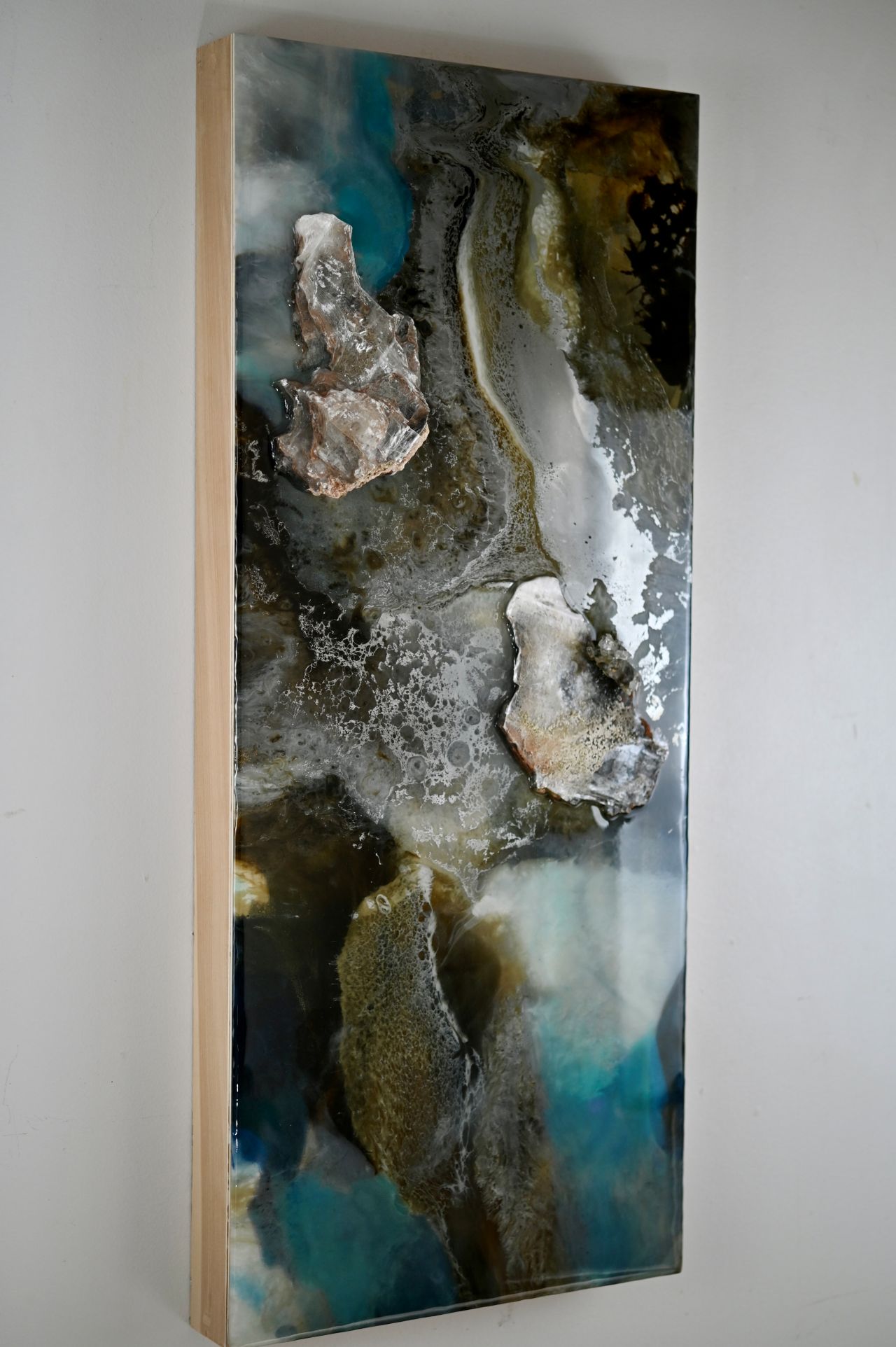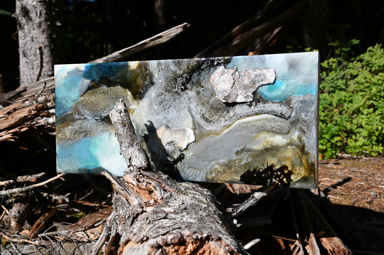 Earthy yet uplifting, this contemporary piece is a bit mysterious and would blend well with many colours found in a space.